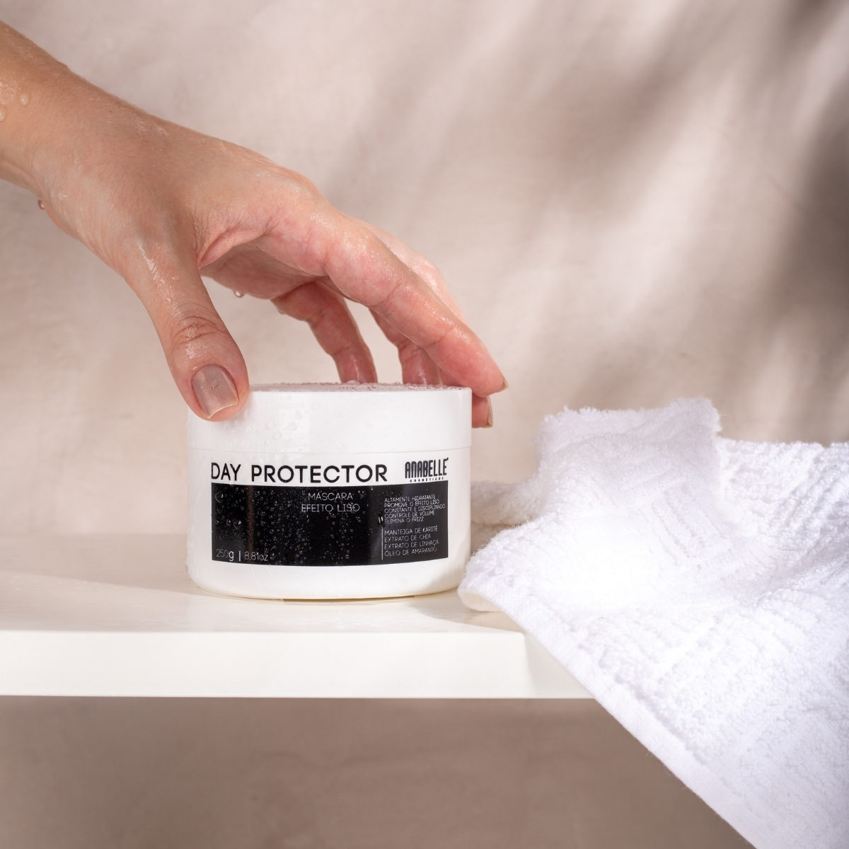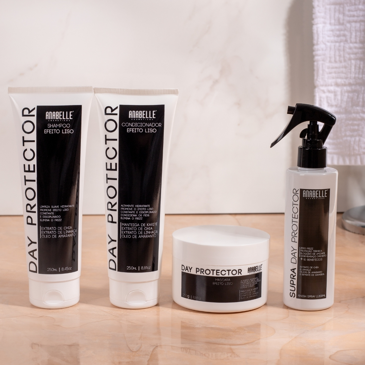 - Shampoo Day Protector (250ml): limpeza suave e hidratante, com espuma cremosa que prolonga o efeito liso e sela as cutículas.